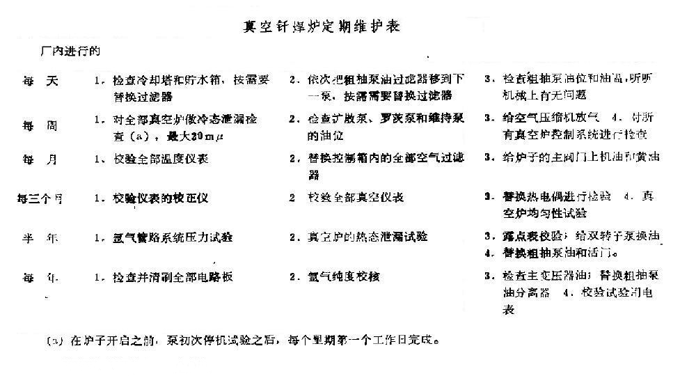 夹具是真空钎焊炉的另一个常见污染源。夹具应同工件一道进行清洗,以防将污物带进钎焊接头或真空炉中。夹具资料应能经受所到达的钎焊温度。在1900。F(1038℃)进行镍的钎焊时不小心运用了青铜和铝做夹具零件所引起的损坏. 对工件来说是灾难性的, 并且对炉子内部的损坏也是严峻的。为此,真宅炉得停机几天至几个星期,这取决于关键配件的置办和修补作业的功率。因为每天例行的钎焊作业, 上述外来物会导致隔热屏(绝热套的外表)辐射才干逐渐降低, 这是因为不断氧化和磨损的堆集所形成的。产品或钎焊料所形成的任何一种辐射才干的削减无法用延伸内部绝热资料作业寿数来补偿, 并且还降低了功率要求和耗费。坚持真空炉的功用要坚持真空炉的最佳功用需求严格遵守定期保护的程序 真空炉保养要求的一个实例见表。